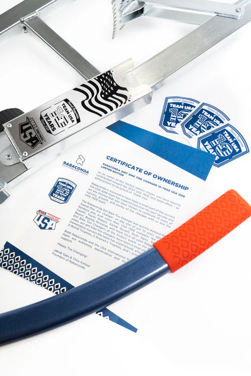 Celebrate a decade of partnership with Team USA ISDE with this daring Limited Edition Dirt Bike Tire Changer. Only 200 made, featuring a bold blue anodized bead breaker arm, red silicone grip handle, and exclusive 10-year anniversary emblems. Every purchase directly supports Team USA’s journey to compete in the world’s toughest race. Comes with a special edition bag, printed tire iron pocket, commemorative stickers, and a Certificate of Ownership—gear up and ride with the team!